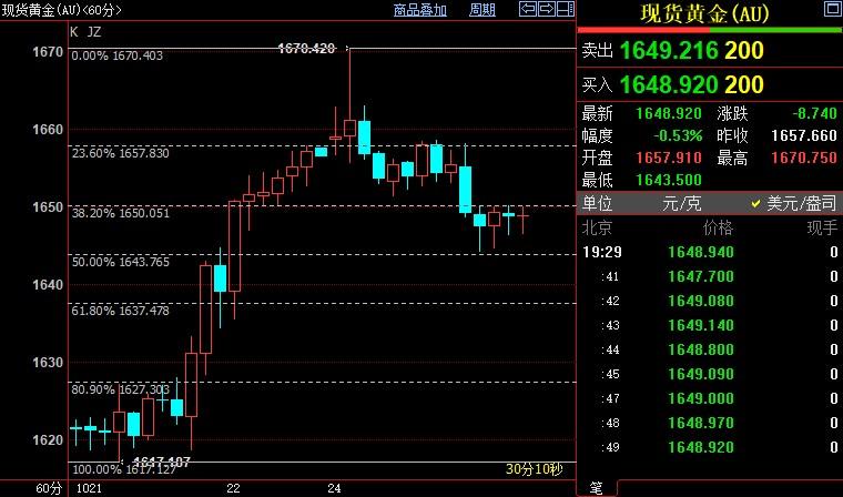 北京时间20:11, 现货黄金 下跌0.40%至1649.35美元/盎司;COMEX期金主力合约下跌0.14%至1653.7美元/盎司; 美元指数 上浮0.22%至112.120。