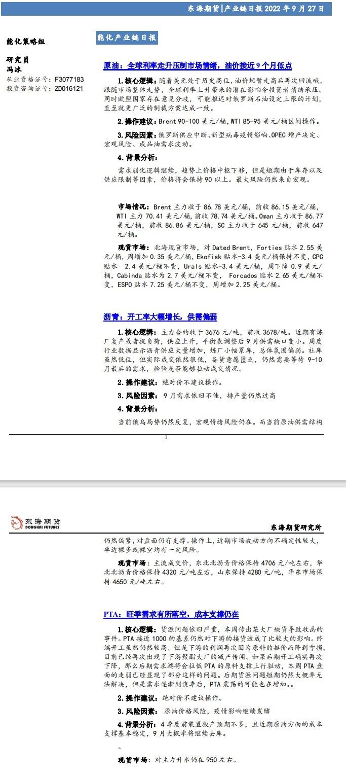 标题:【东海期货9月27日产业链日报】能化篇:全球利率走升压制市场情绪,油价接近9个月低点