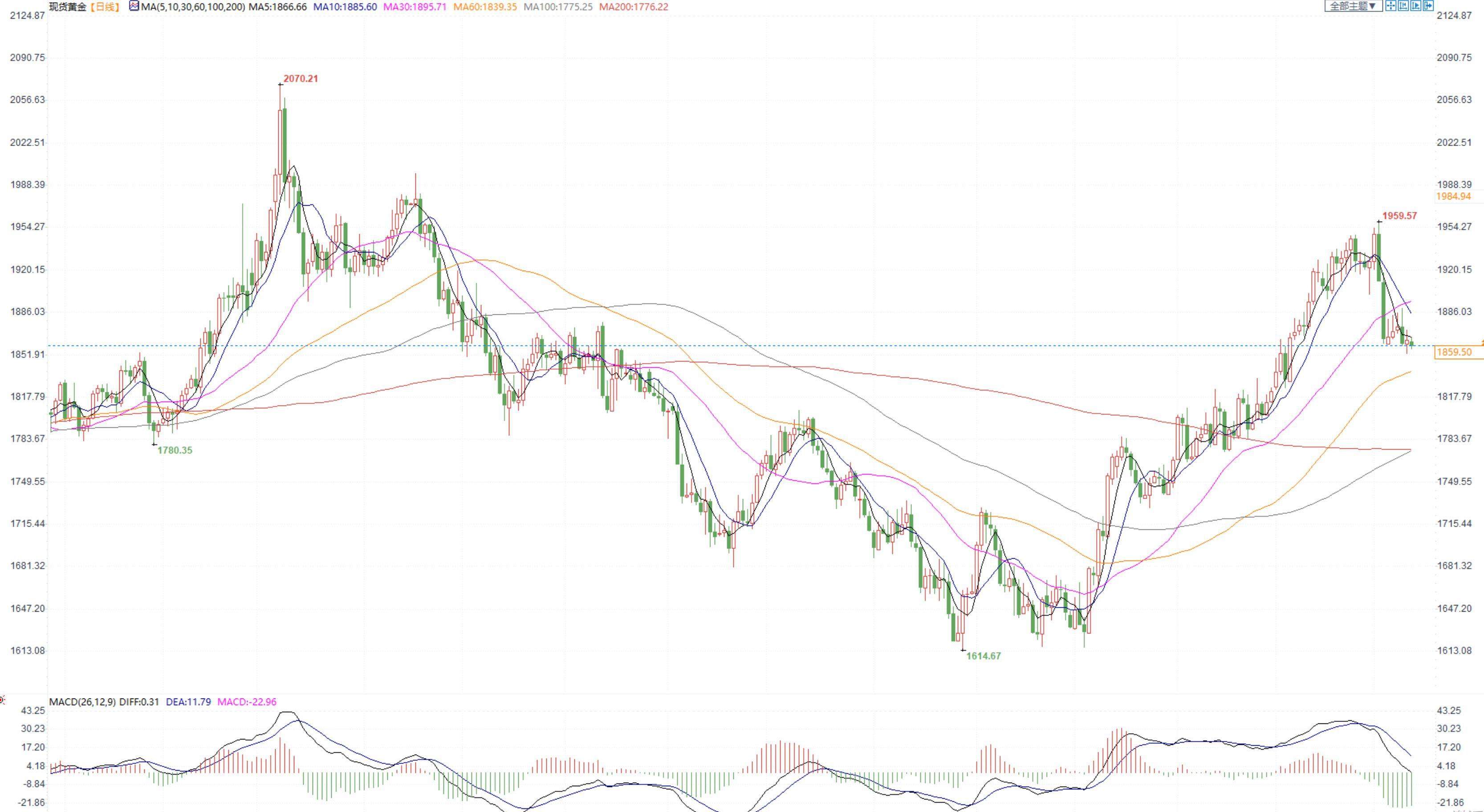 【今日行情】金银涨跌互现。AU2304收盘价为413.08,收涨0.27%;AG2306收盘价为4939,收跌0.62%。上周五晚间 美元指数 “V”型反弹走强,今日也是震荡偏强,仍处于103关口之上,十年期美债收益率大幅上升至3.7%,短期对金银支撑减弱。