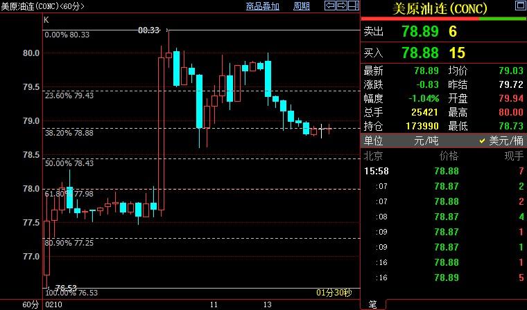 小时图上看,NYMEX原油料进一步下探78.43美元和77.98美元,它们分别是76.53美元-80.33美元上涨区间的50%斐波那契回档位和61.8%斐波那契回档位。