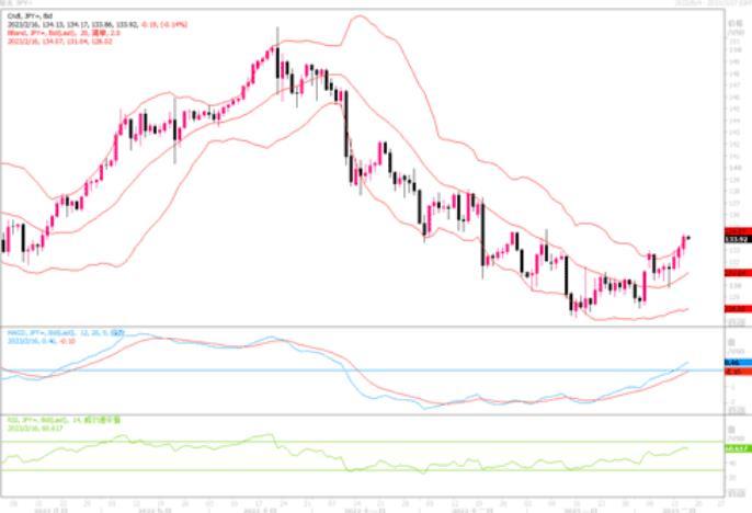 周三(2月15日)在美国公布高于预期的通胀数据后, 美元兑日元 盘中曾急升至134.355,为1月6日以来最高。但尾市收盘阶段自高位略有回落,收盘于134.13水平。美国通胀率仍居高水平,美联储基准利率峰值预期不断提高,提振者 美元兑日元 的继续自低位反弹之中。技术图形上,周三K线上继续显示阳柱体, 美元兑日元 已攻克10月至1月跌势的23.6%技术位133.05,增加了牛市的倾向。日线动能指标为正。继续上行的话,若穿破135.00心里关口,上方136.66的38.2%回撤位发将是多头的进攻目标。但短线4小时图上出现超买,应防范 美元兑日元 短期获利回吐调整风险的出现。