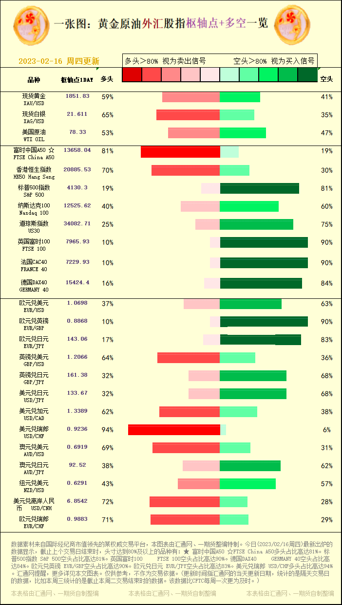 一张图:黄金原油外汇股指"枢纽点+多空占比"一览(2023/02/16周四)
