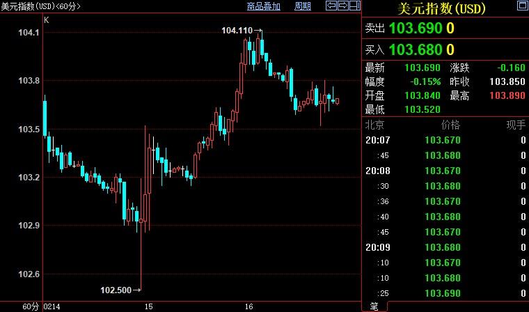 北京时间20:08, 现货黄金 上浮0.06%至1836.95美元/盎司;COMEX期金主力合约上浮0.07%至1846.5美元/盎司; 美元指数 下跌0.17%至103.688。