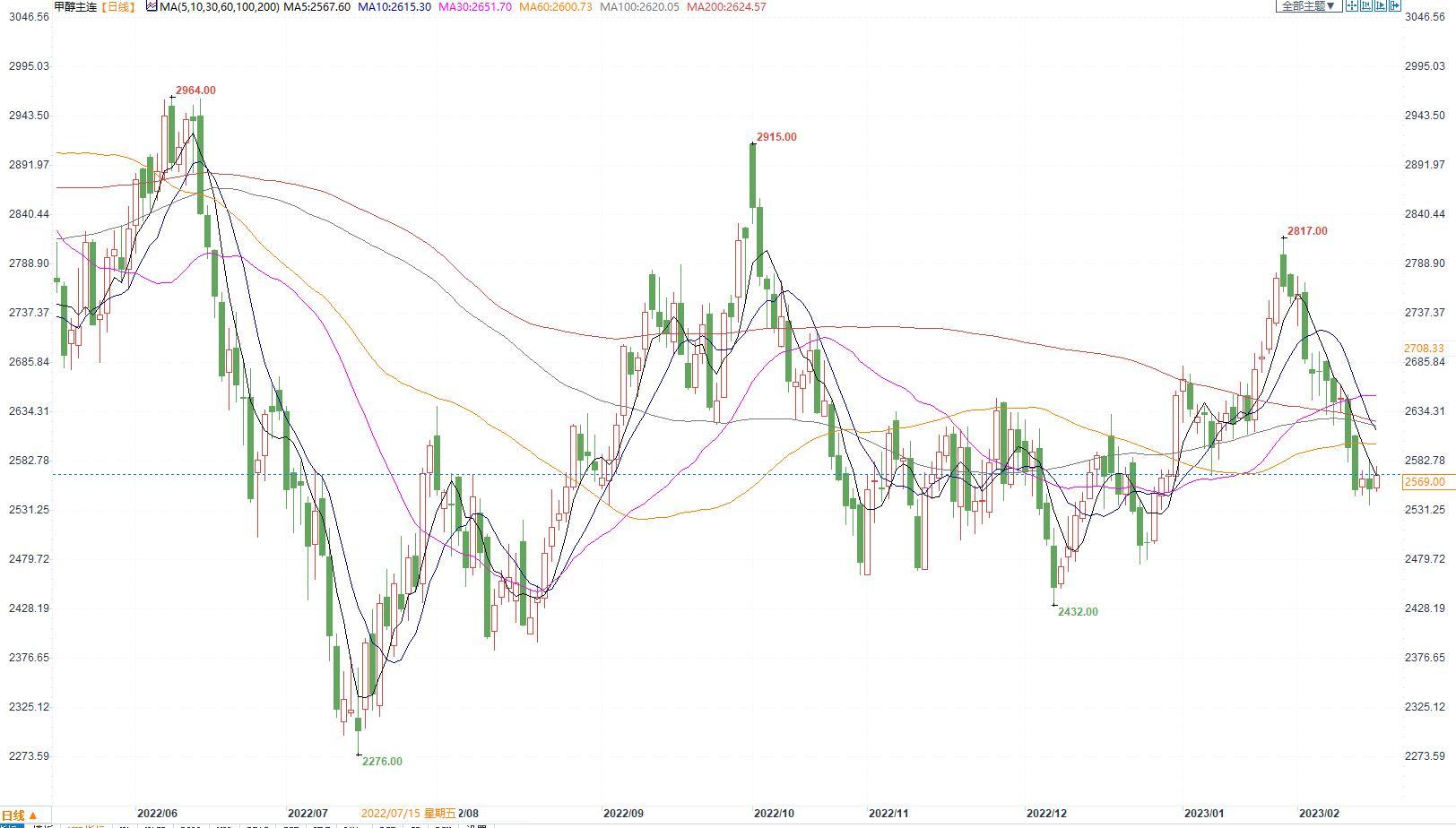 期货市场,甲醇2305合约小幅收涨,收盘价2569。张家港地区参考价格2720-2725元/吨附近现汇出罐。