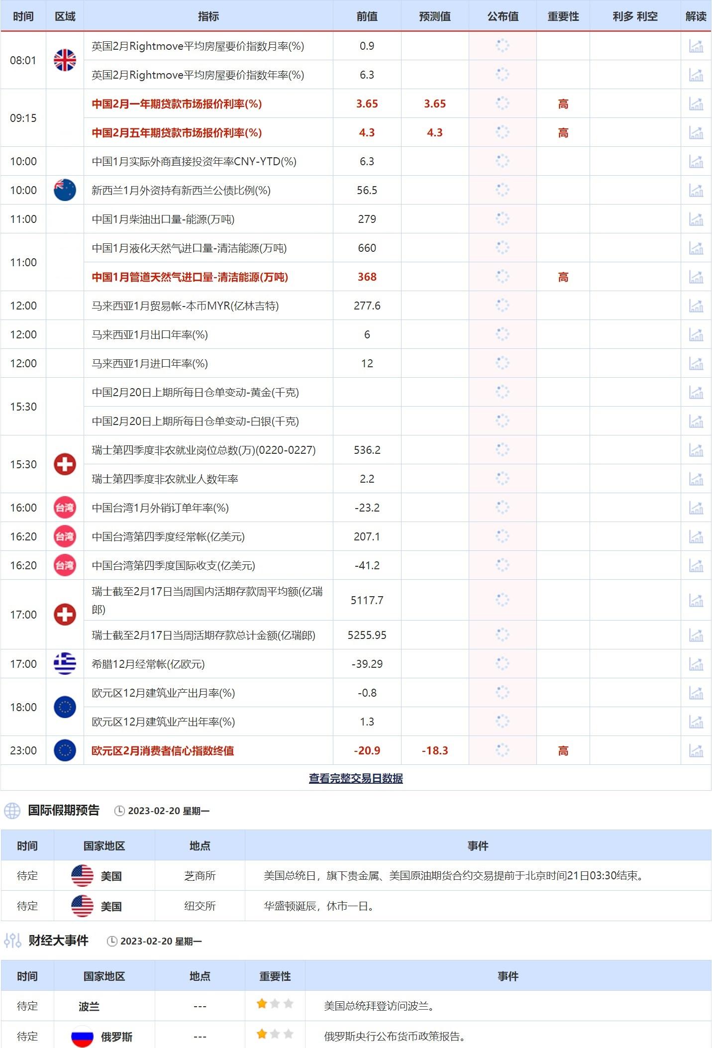 2月20日重点数据和大事件前瞻