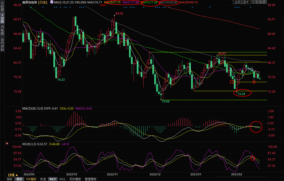 日线级别: 震荡;MACD轻微死叉,KDJ死叉,油价周二再次反弹受阻,并继续承压于所有均线下方,5日均线下穿55日均线结成死叉,在顶破55日均线77.28前,油价短线偏向震荡下行,初步支撑在上周五低点75.05附近,如果失守该,则增加短线看空信号,布林线下轨支撑目前在73.94附近,强支撑在2月7日低点72.24附近,短线下破难度较大。