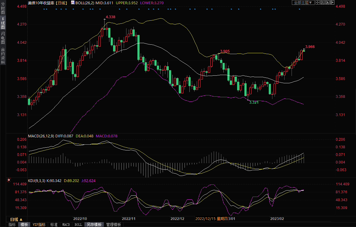10年期国债收益率达到3.962%,为11月10日以来最高,从1月19日触及的四个月低点3.321%反弹。 两年期国债收益率一度高见4.738%,为11月8日以来最高。