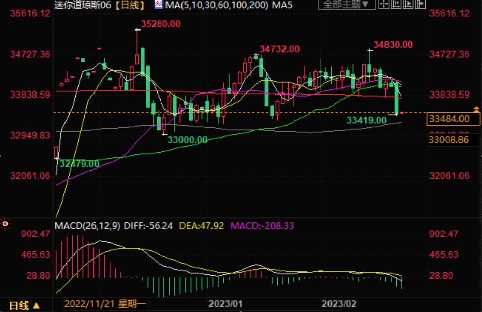 截止当天收盘, 道琼斯工业 平均指数下跌697.1点,跌幅2%,至33129.59点。在三大指数中,道指率先回吐了今年以来的所有涨幅。