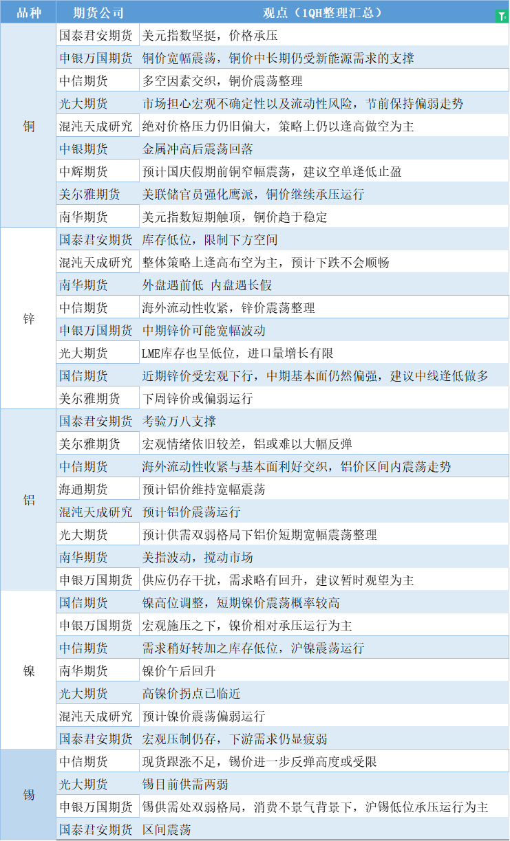 标题:期货公司观点汇总一张图:9月28日有色系(铜、锌、铝、镍、锡等)