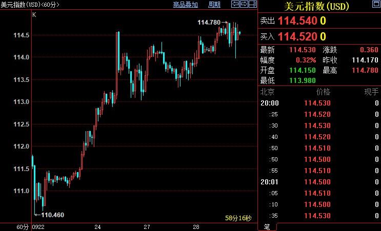 北京时间19:59, 现货黄金 下跌0.28%至1624.34美元/盎司;COMEX期金主力合约下跌0.25%至1632.1美元/盎司; 美元指数 上浮0.34%至114.528; 英镑兑美元 下跌1.33至1.0588。