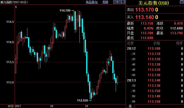 北京时间20:13, 现货黄金 下跌0.57%至1650.31美元/盎司;COMEX期金主力合约下跌0.71%至1658.2美元/盎司; 美元指数 上涨0.41%至113.157。