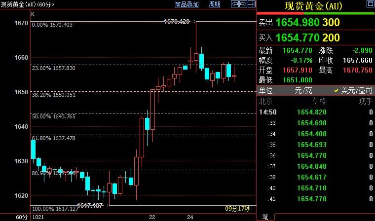 小时图上看,金价运行在1650美元上方,跌破后将进一步下探1644美元,它们分别是1617美元-1670美元上行区间的38.2%斐波那契回档位和50%斐波那契回档位。